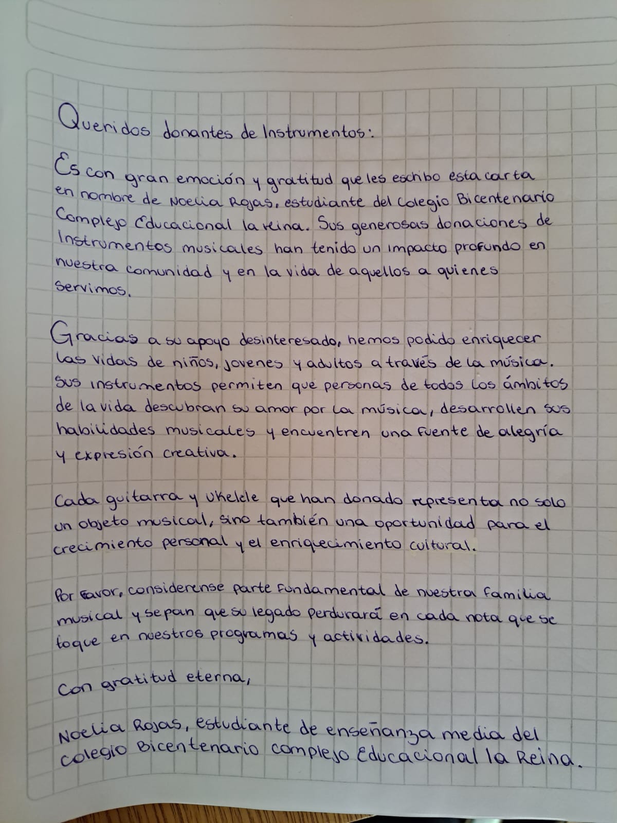 Mis estudiantes son personas muy motivadas, talentosas y con ganas de superarse cada día. Son especialmente cariñosos, empáticos y con un gran sentido de la responsabilidad. Sueñan con poder contar con guitarras y ukeleles para su clase de música y para realizar talleres. Sin embargo, la mayoría provienen de contextos vulnerables (87%) donde gran parte no posee un instrumento musical. Para ellos la música es un agente movilizador y de resguardo, un espacio de desarrollo integral, de bienestar y de regulación emocional; aspectos cruciales a cuidar y fomentar en la actualidad.