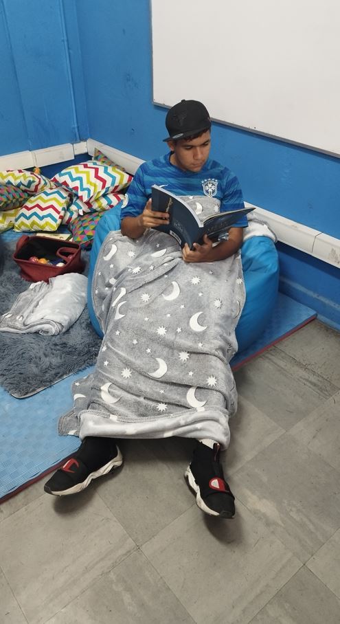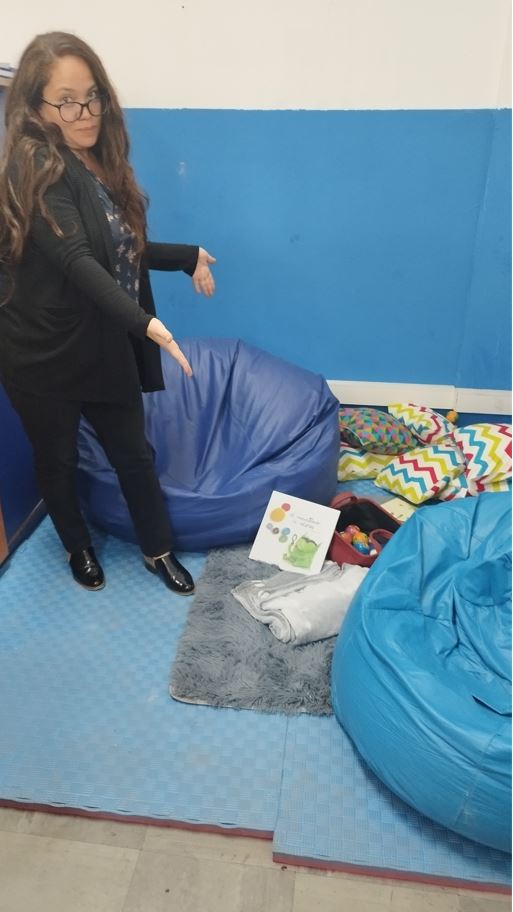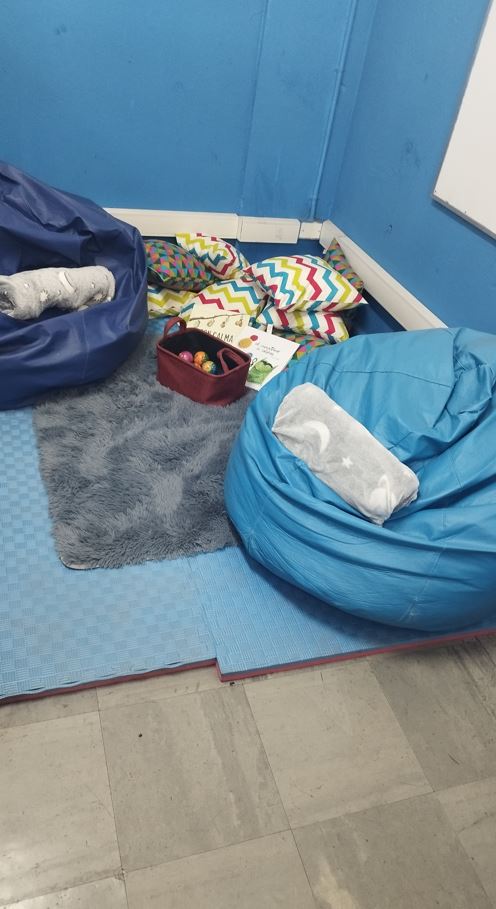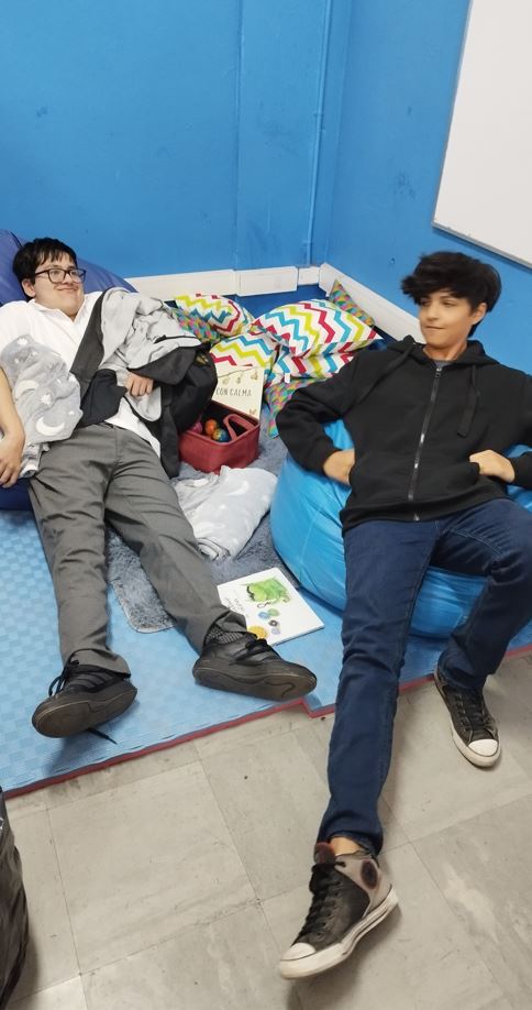 Por ello es que co- diseñamos con los estudiantes un proyecto para la gestión de emociones, en donde en primera instancia soñaron con un espacio de contención, lo dibujaron, buscaron los elementos que tendría e hicieron un presupuesto de materiales. Buscaron elementos para este espacio, un lugar que les haga sentir resguardados y en donde puedan encontrar la calma, luego de una desregulación emocional.