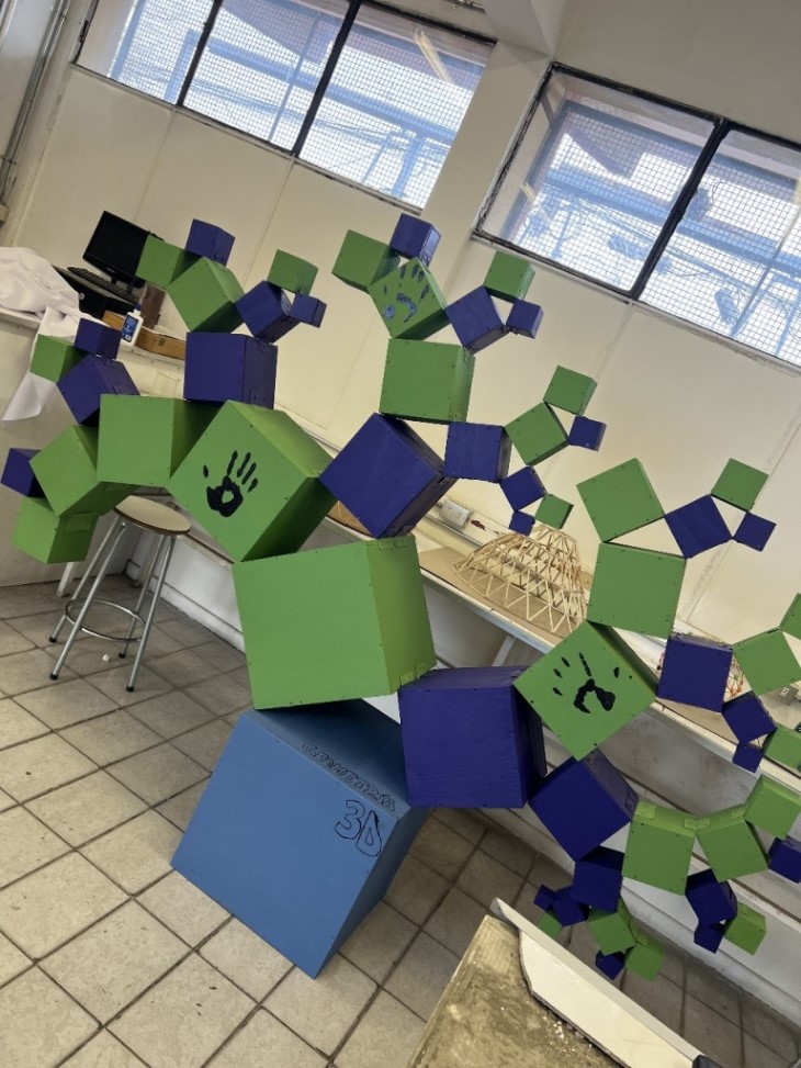 Nuestro proyecto consiste en que los estudiantes tengan la oportunidad de diseñar y generar un árbol pitagórico 3D con un tamaño cercano a los tres metros de ancho y dos metros de alto, que nos permita poder apreciar las características especiales de un fractal de ese tipo, con sus ángulos rectos y agudos, además de experimentar en la construcción de cuerpos geométricos a distintas escalas con materiales de construcción y herramientas de uso domiciliario. En una primera fase tendrán que confeccionar cubos grandes desde los 50 cm hasta unos más pequeños de 5 cm aproximadamente, pasando a una segunda fase de montar una estructura donde se contemple el teorema de Pitágoras en cada uno de los tríos de cubos, terminando con una última fase de decoración para hacer su trabajo aun mas vistoso y llamativo para el resto de la comunidad educativa.