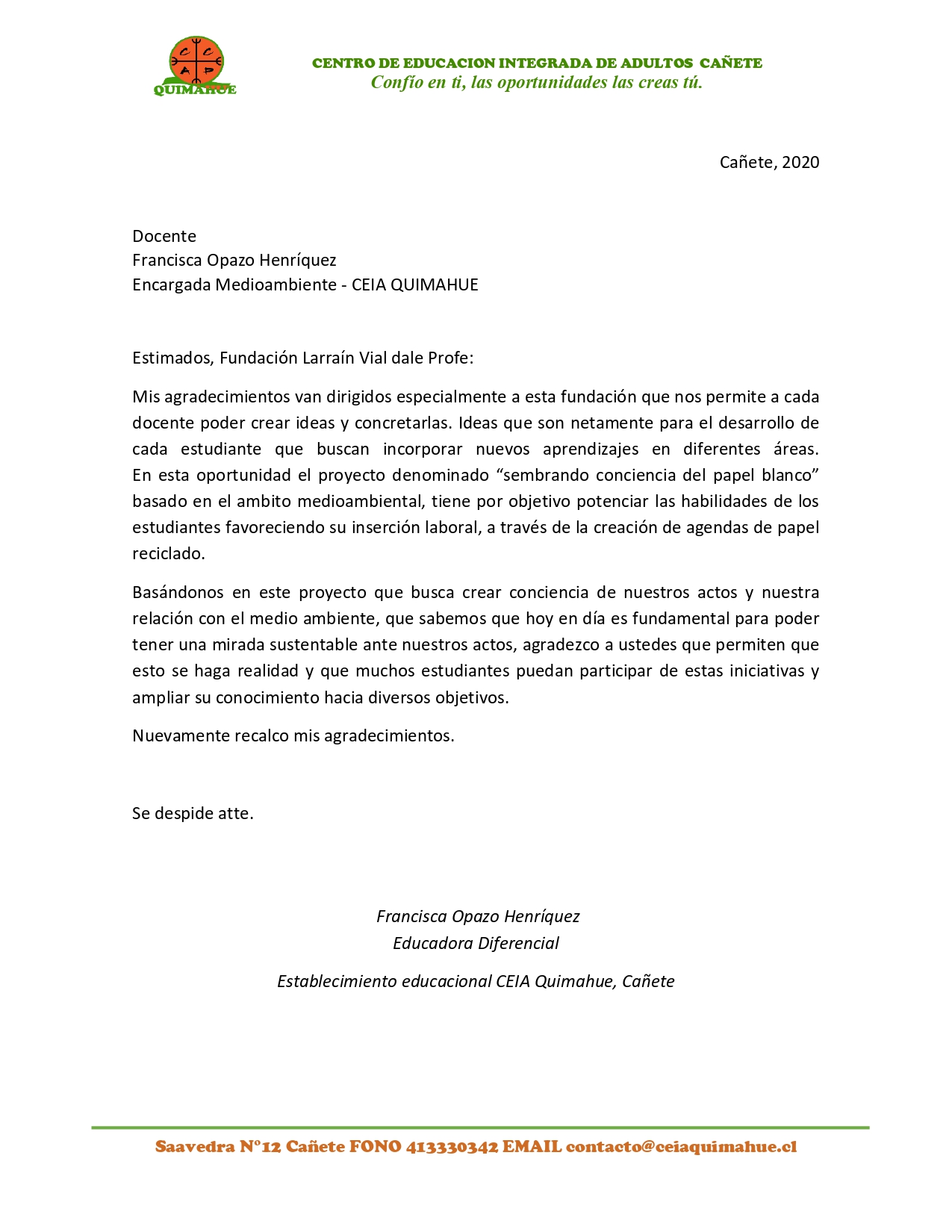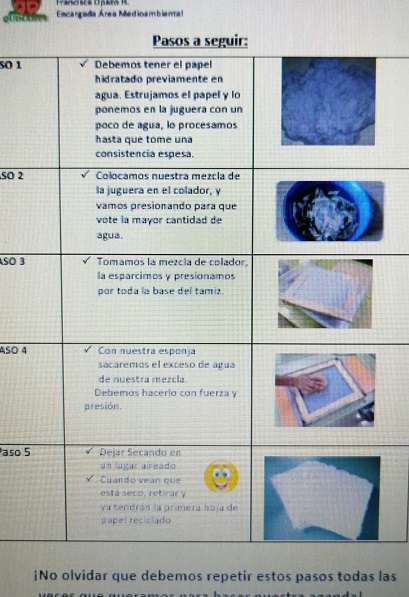El proyecto consiste en el trabajo en equipo con los estudiantes, enfocados en la preparacion de libretas recicladas del papel blanco. Nuestros estudiantes son adultos motivados a insertarse en el mundo laboral y social, aprendiendo estrategias y habilidades. Esta actividad permitiria a cada uno desarrollar dichas habilidades enfocadas en el reciclaje de papel blanco para la creacion de libretas o agendas, permitiendoles desenvolverse en su entorno educativo y su entorno mas cercano. Al entregar estas posibilidades de desarollo y participacion en conjunto con sus compañeros, se busca desarrollar la confianza en si mismos y la capacidad de resolver problemas.