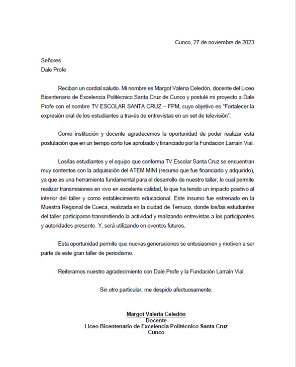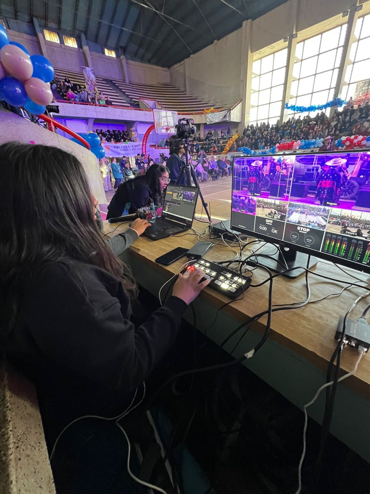 Durante la pandemia, surgió la necesidad de implementar un taller de periodismo el cual permitiera reforzar las habilidades comunicativas en los estudiantes. Se inició con entrevistas breves hasta llevar a cabo transmisiones en vivo de las actividades realizadas y que por motivo de restricciones sanitarias, permitió que las familias, a través, de la fan page del establecimiento, fueran parte de los actos de titulaciones, licenciaturas, investiduras, fiestas patrias, entre otras acompañando a sus hijos a la distancia. Una vez que ya regresamos a la normalidad, se comenzó a trabajar en la realización de programas donde los invitados forman parte de la comunidad educativa y del extranjero. De esta manera surge la idea de implementar un set de televisión que cumpla con ciertos requerimientos, lo que permita acercarnos, generando un espacio de conversación para dar a conocer actividades pedagógicas, noticias, entre otros. Y también, a través de los streaming mostrar a la comunidad nuestro proyecto educativo.